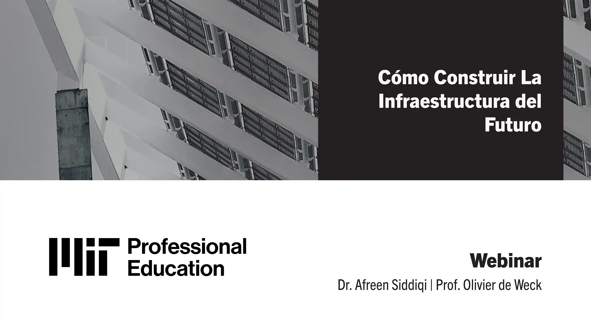 Vuelve a ver este webinar presentado por la Dr. Afreen Siddiqi y el profesor de sistemas de ingeniería del MIT, Olivier de Weck. Los dos expertos se unen para discutir varios de los asuntos actuales relacionados con el desarrollo de Infraestructuras Sostenibles. Juntos aplican un enfoque con vista al futuro, y hablan sobre los países que lideran el mundo en iniciativas sostenibles, los desafíos geopolíticos y económicos innatos de implementar políticas reformistas, el uso evolutivo de los recursos globales de nuestro planeta, la logística del transporte, los matices de centralización versus descentralización, y más.