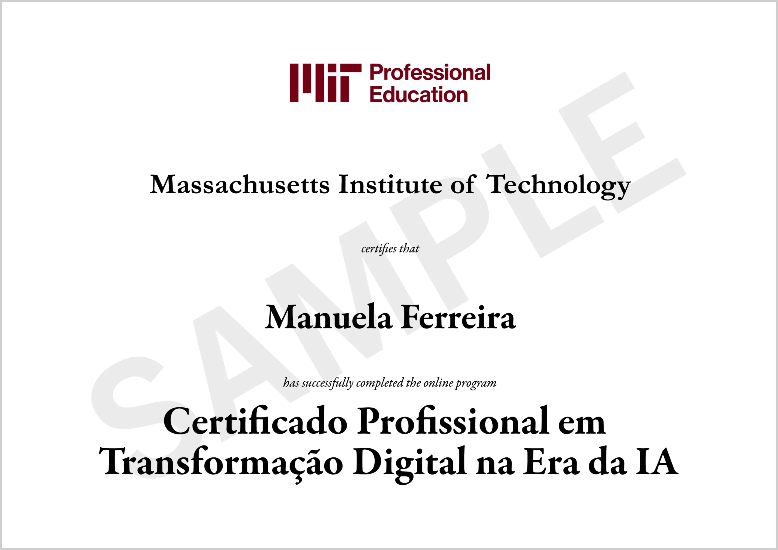 Todos os participantes que tenham êxito na conclusão do Transformação Digital receberão um Certificado do MIT Professional Education por cada curso, uma certificação global do MIT Professional Education e * de Continuing Education Units (unidades de Educação Continuada).